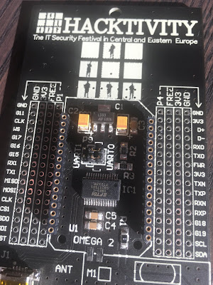 But here is a catch. You can get a root shell on the device. And it is pretty straightforward. Just carefully remove the Omega shield from the badge. Now you see two jumpers; by default, these are connected together as UART1. As seen below.